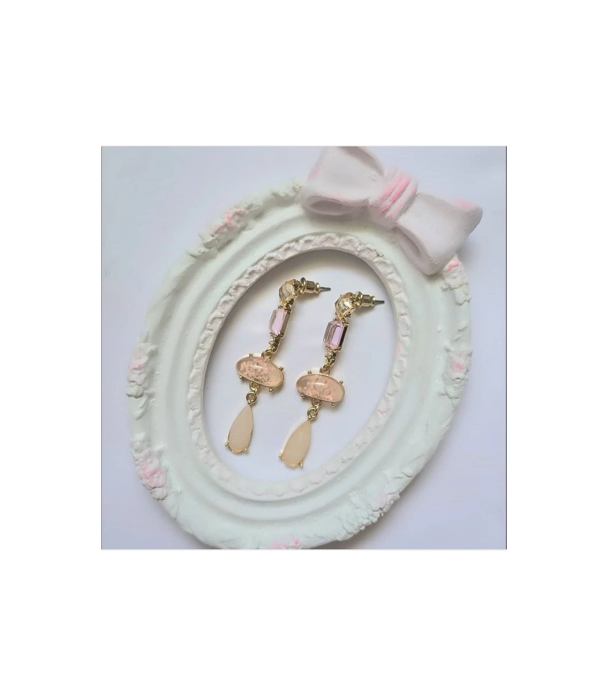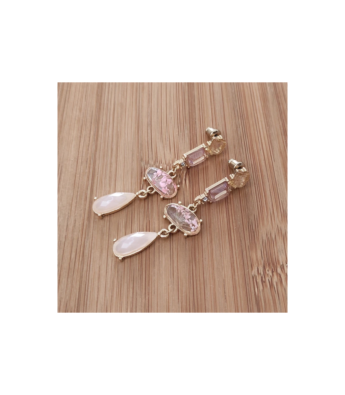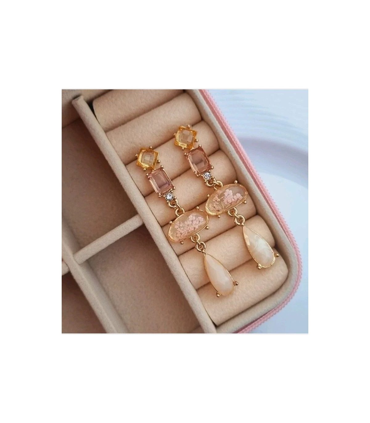 در بخش بالایی، نگین چهارگوش زرد عسلی با تراش منظم قرار گرفته است. این نگین پایهای شیک برای ساختار گوشواره ایجاد میکند. نگین مستطیلی صورتی–نارنجی با تهمایه رزگلد، حس لطافت و ظرافت زنانه را تقویت میکند. میان این دو نگین، یک نگین ریز شفاف وجود دارد. این نگین درخششی شبیه برلیان ایجاد کرده و نور را به زیبایی منعکس میکند. این جزئیات هویت بصری گوشواره زنانه E2643 i am را شکل میدهند.